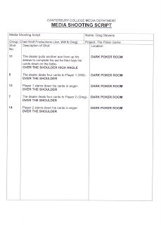 The first step towards creating our script was to make a treatment to give a breif description of what would appear on screen. We then had to adapt the treatment into a first draft of a script. We had finished a first draft but it wasn't perfect so we worked with our teacher Rick to help see where we could improve on it before putting the script into a storyboard. Although we decided the idea and story was basically good we were warned about the difficulty of successfully creating the effect of a serious poker game and he advised us to add some conflict. We first decided a way of adding conflict and came to the idea of adding the cheating aspect into the script. This worked well as it allowed us to become more imaginative with exactly what we could do with our film. It opened many more doors in how we could make our movie stand out. We finally came with a final draft and were ready to move on.